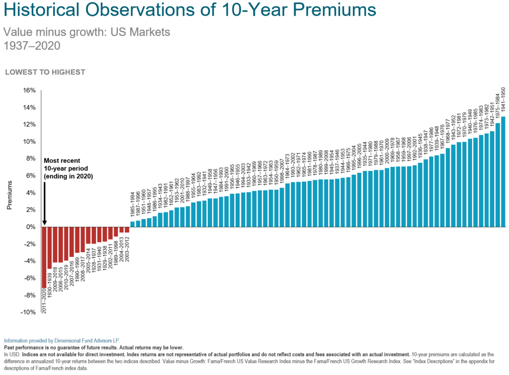 Stock market history should inform strategy, but can’t ever predict, much less guarantee, the future performance of any investment. That said, the superior long-term performance of value stocks over growth stocks is one of the best-documented phenomena in financial economics.